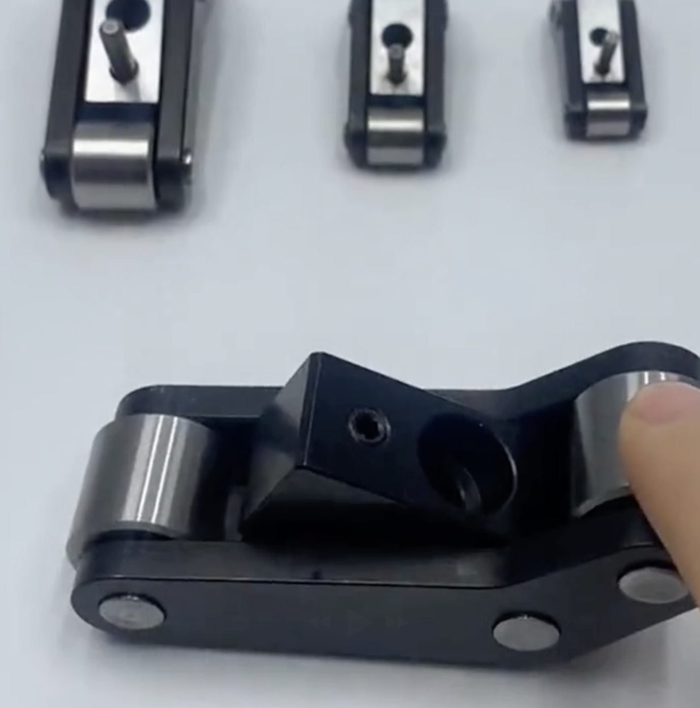 The rocking lever experiences significant cyclic loading. We recommend through-hardened tool steels (like S7 or H13) at 48-52 HRC for optimal wear resistance without brittleness.